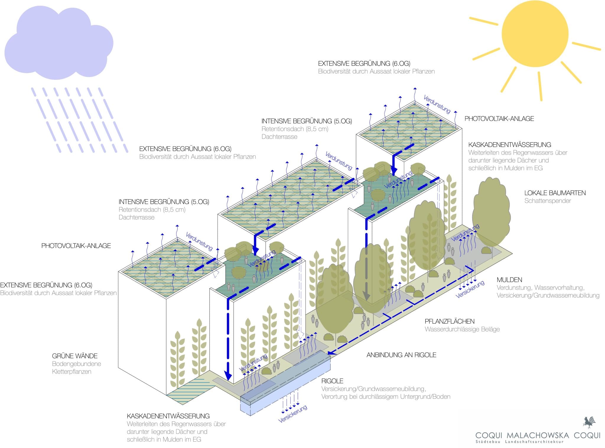 Das in den Gärten im Süden anfallende Regenwasser wird mittels Bodenmodellierung den Pflanzflächen zur Verfügung gestellt. Überschüssiges Regenwasser aus dem 5./6. OG und aus den Loggien wird durch eine offene Zuleitung in die leichten Senken der Pflanzflächen (10-25 Zentimeter) und in den Rasen geführt. Das Wasser wird durch die Pflanzen genutzt, im unterkellerten Bereich sickern die überschüssigen Mengen durch das intensive Dachsubstrat (80 Zentimeter) bis zum Dränelement FKD10, das das Wasser unterirdisch in eine Rigole abführt. Oberflächige Rückhaltevolumen und die unterirdische Rigole schützen als Regenwasserretentionselemente vor allem im Starkregenfall.